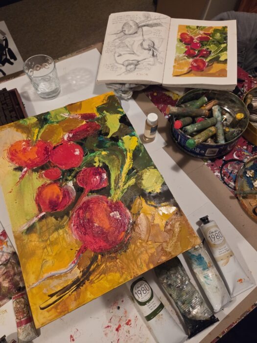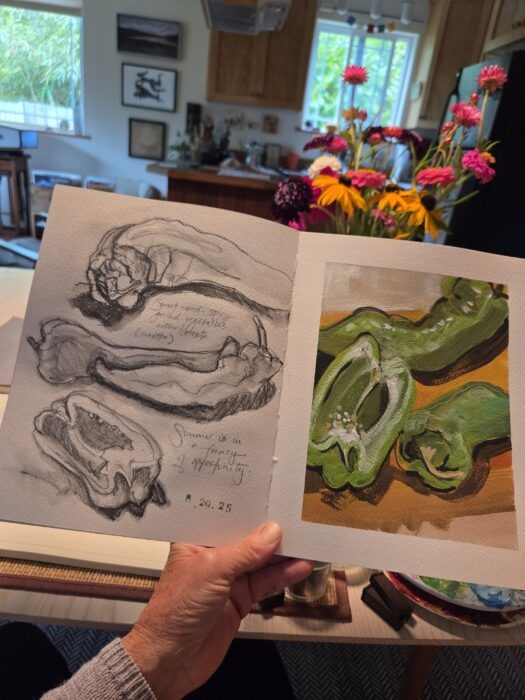 In the studio, the art journal entries are becoming paintings, working toward a solo exhibit at Aurora Loop Gallery in May 2026. It is pleasure to paint what I love, to paint what I am living, and to dig into the metaphor of “Still, Life.”